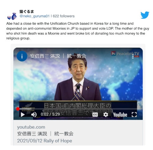 Aby bylo jasno, nejpřímějším prohlášením o „jisté organizaci“, které se zatím objevilo, je zpráva, že Yamagami „měl v úmyslu zaměřit se na vysokého představitele náboženské skupiny“, který v té době zřejmě nebyl na místě činu, což znamená, že Abe ani nebyl hlavním cílem atentátníka. Na druhou stranu tatáž zpráva také uvádí, že „podezřelý učinil nesmyslná prohlášení a policie Nara pečlivě zkoumá, zda je duševně způsobilý k trestní odpovědnosti“, takže všechny tyto informace berte s obrovskou rezervou.