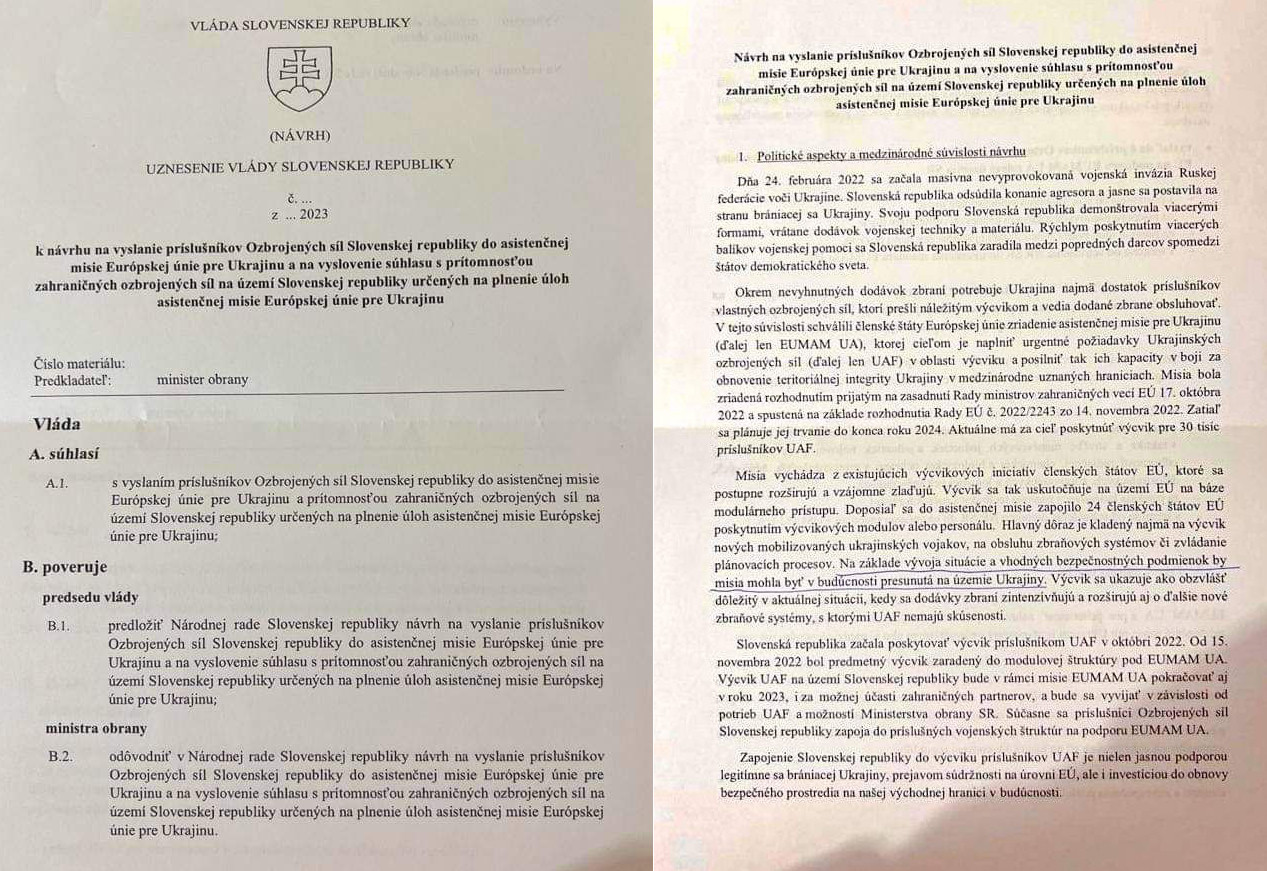 „Predseda vlády má tento dokument predložiť do NR SR a minister obrany ho má NR SR následne odôvodniť. Podľa tohto návrhu má Slovensko pomôcť zabezpečiť Ukrajine dostatok príslušníkov ozbrojených síl. Najskôr výcvikom na slovenskom území, a následne na základe vývoja situácie a vhodných bezpečnostných podmienok by misia mohla byť v budúcnosti presunutá na územie Ukrajiny,“ varoval Milan Uhrík.