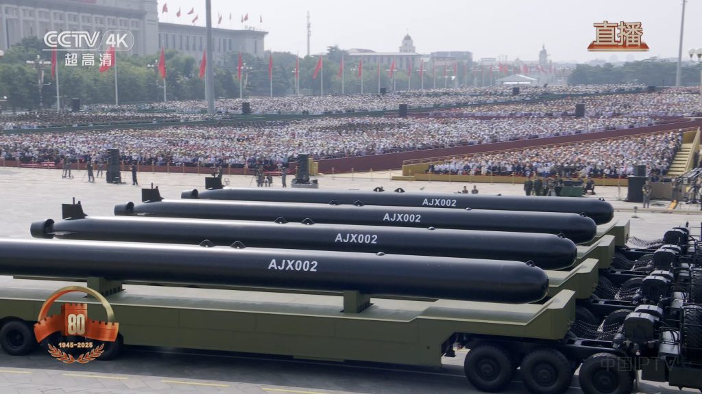 Ďalším impozantným nástrojom jadrového odstrašovania, ktorý bol prvýkrát ukázaný verejnosti na prehliadke, bol podvodný dron AJX-002 – dá sa povedať, že je to analóg ruského Poseidona. Toto zariadenie má dĺžku 20 metrov a priemer 1,5 metra, je schopné pohybovať sa v hĺbke až kilometer rýchlosťou 100 uzlov (asi 200 km/h), pričom výkon jeho jadrovej hlavice je 100 megaton.