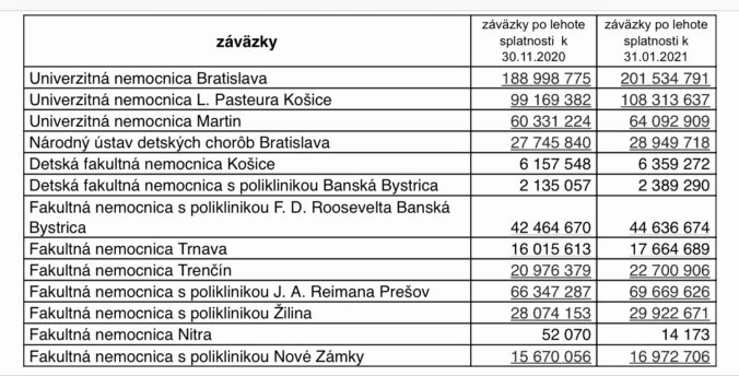 Zároveň ale dopĺňa, že niektorým nemocniciam, napríklad žilinskej či trnavskej, sa podarilo dočasne znížiť stav nesplatených faktúr. Fakultná nemocnica Nitra dokonca dlhodobo a aj napriek pandémii spláca záväzky načas. K januáru podľa dát ministerstva mala dlh o 14,2-tisíc eura, a tak je spomedzi štátnych nemocníc najmenej zadlžená.