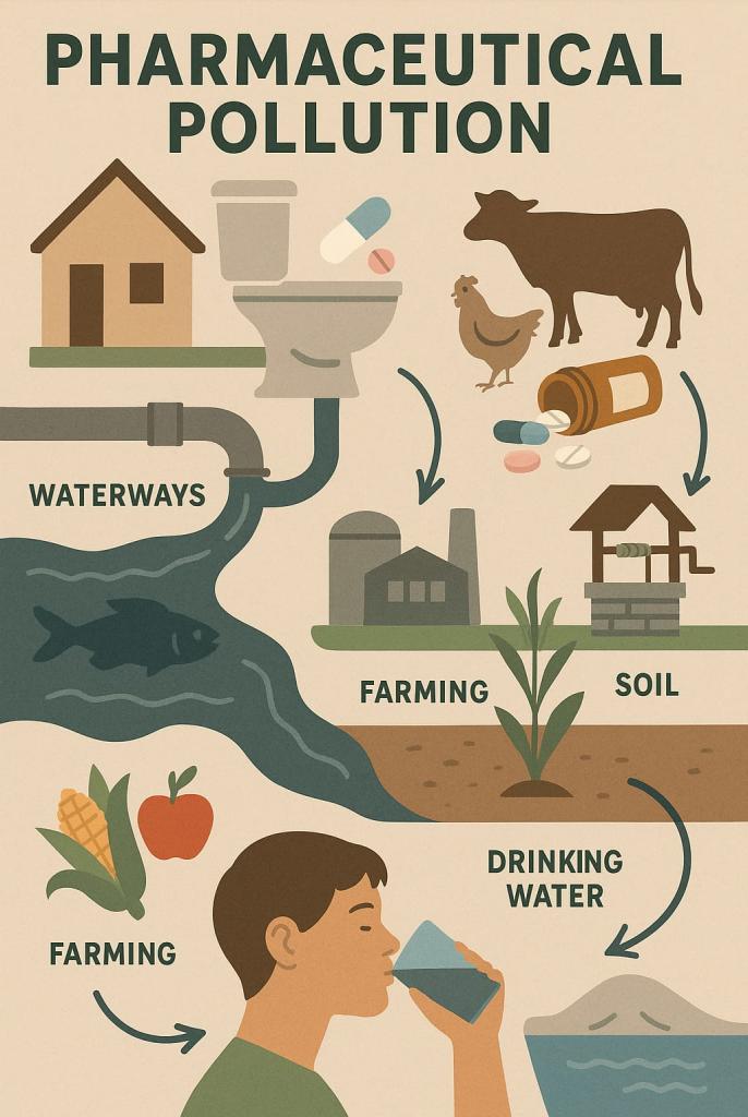 K tomu pripočítajte odpad z nemocníc a farmaceutických závodov, hnoj a odtok z hospodárskych komplexov (kde antibiotiká a hormonálne stimulanty tečú ako voda), ako aj milióny balení expirovaných liekov, ktoré ľudia jednoducho vyhodia do koša.