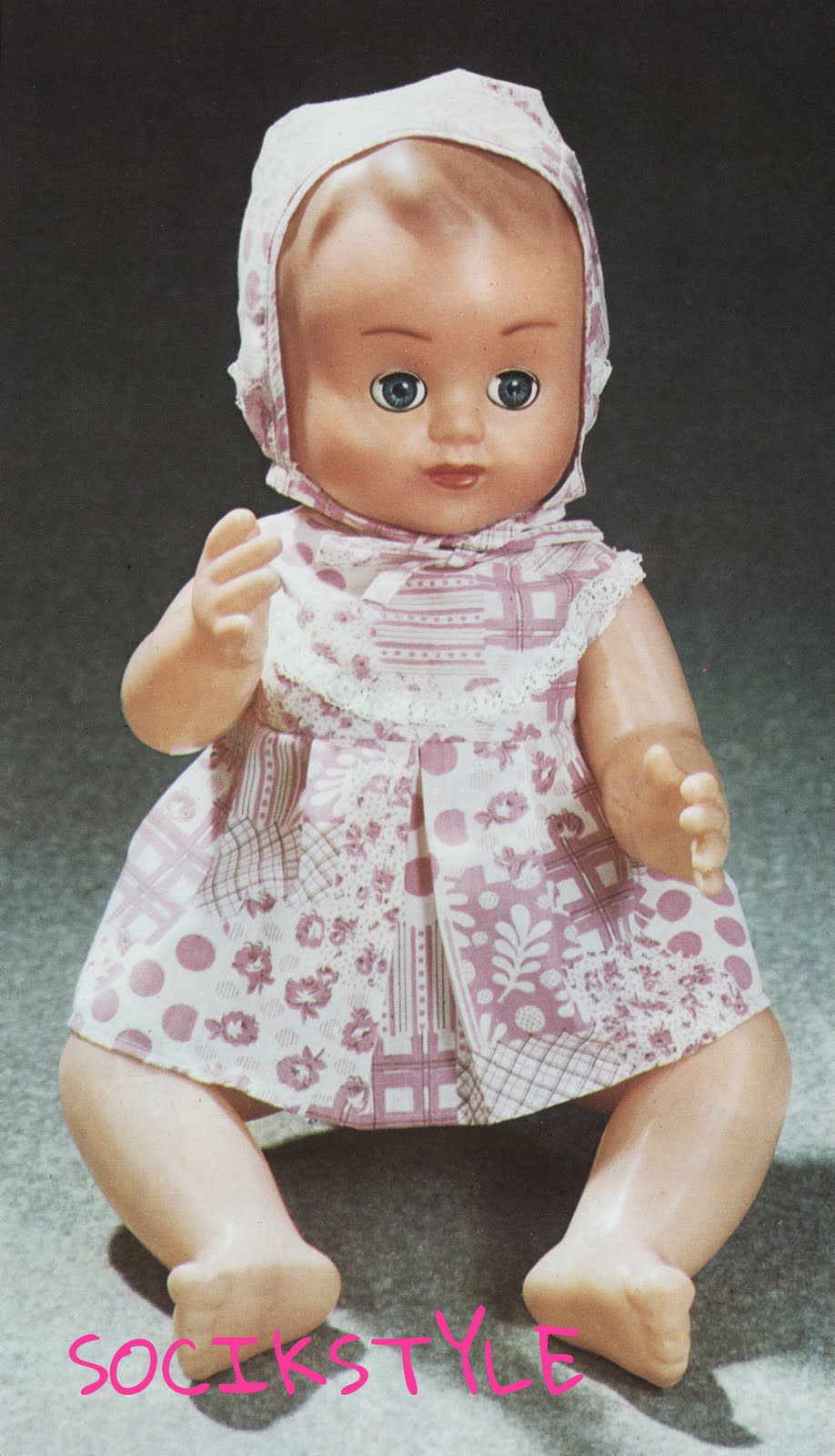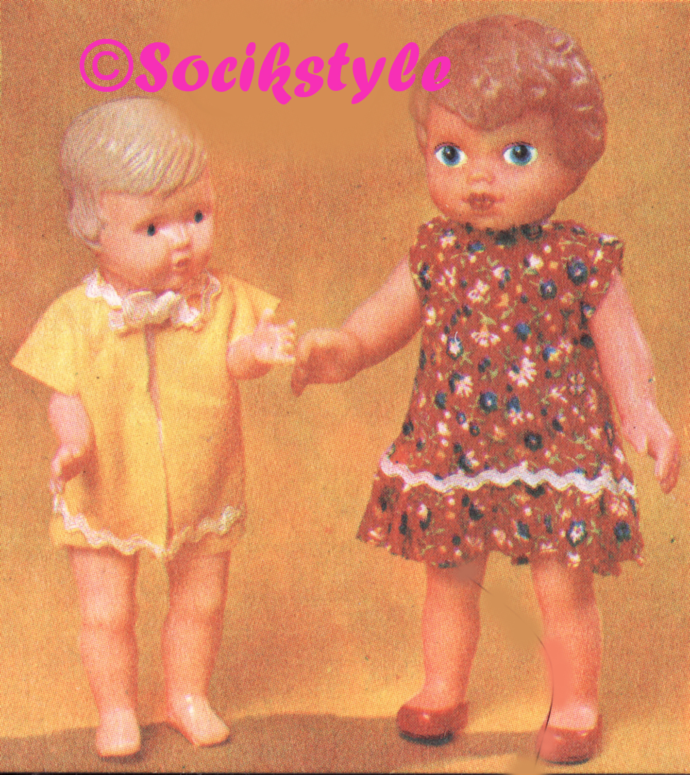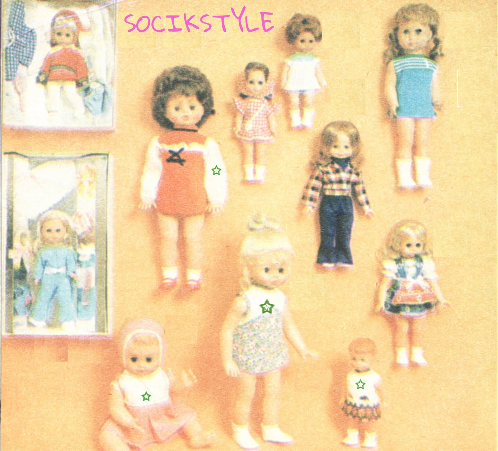 Bábiky vyrobené v ČSSR sú označené zelenou hviezdičkou,miminko-50cm,85Kčs,chodiaca bábika,plačúca-60cm,190Kčs.Bábika z PVC určená pre najmenšie deti-30cm,30Kčs,rok 1974-75.