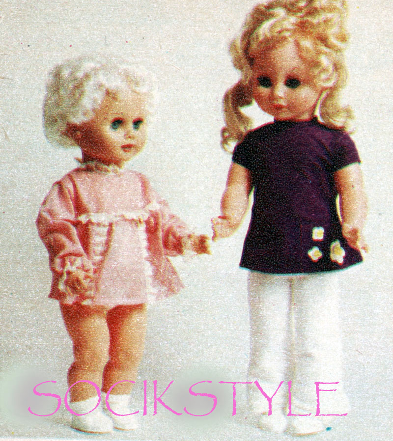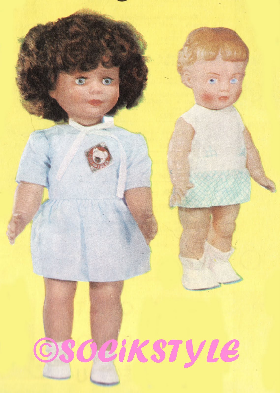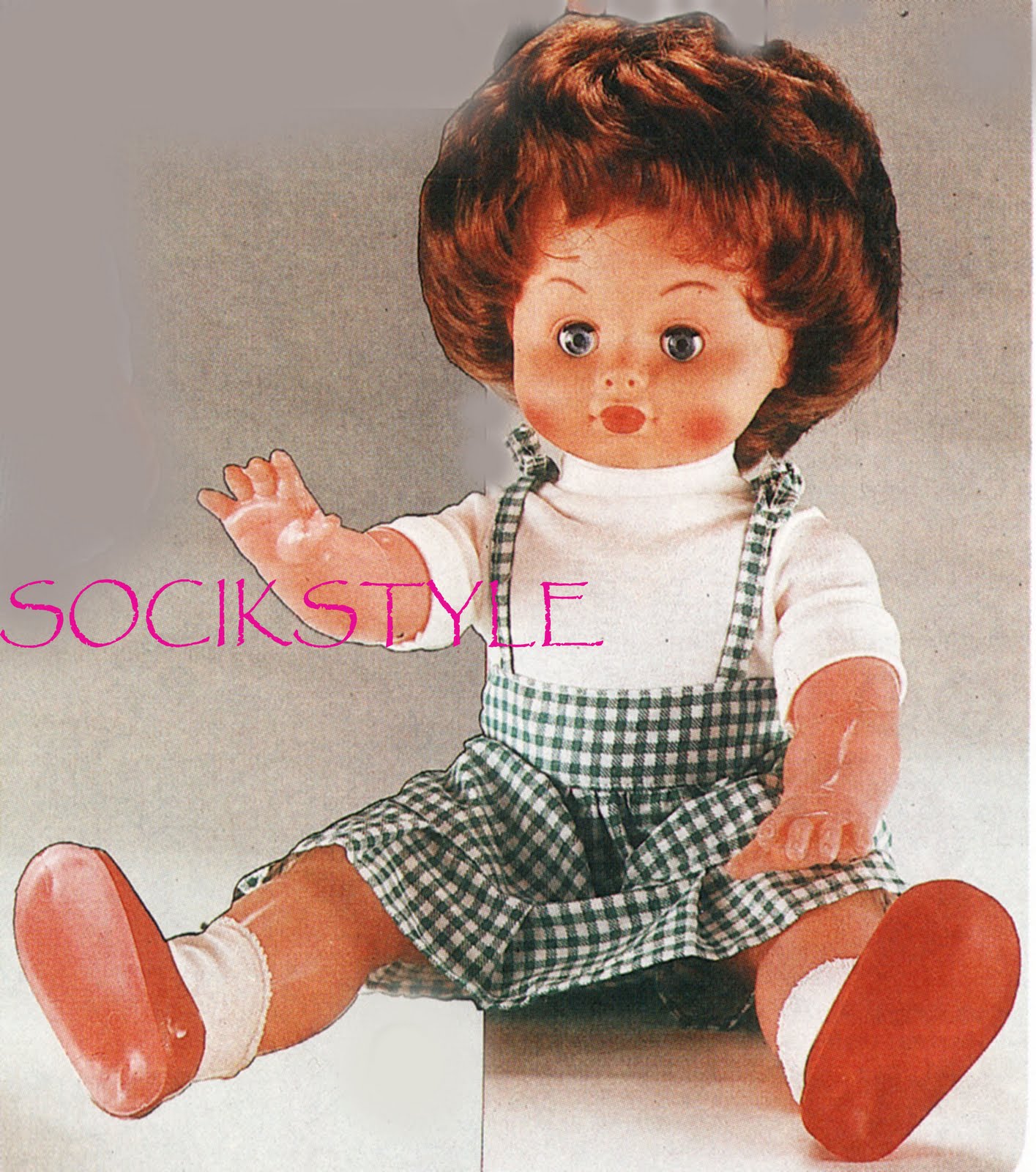 Bábiky vyrobené v ČSSR sú označené zelenou hviezdičkou,miminko-50cm,85Kčs,chodiaca bábika,plačúca-60cm,190Kčs.Bábika z PVC určená pre najmenšie deti-30cm,30Kčs,rok 1974-75.