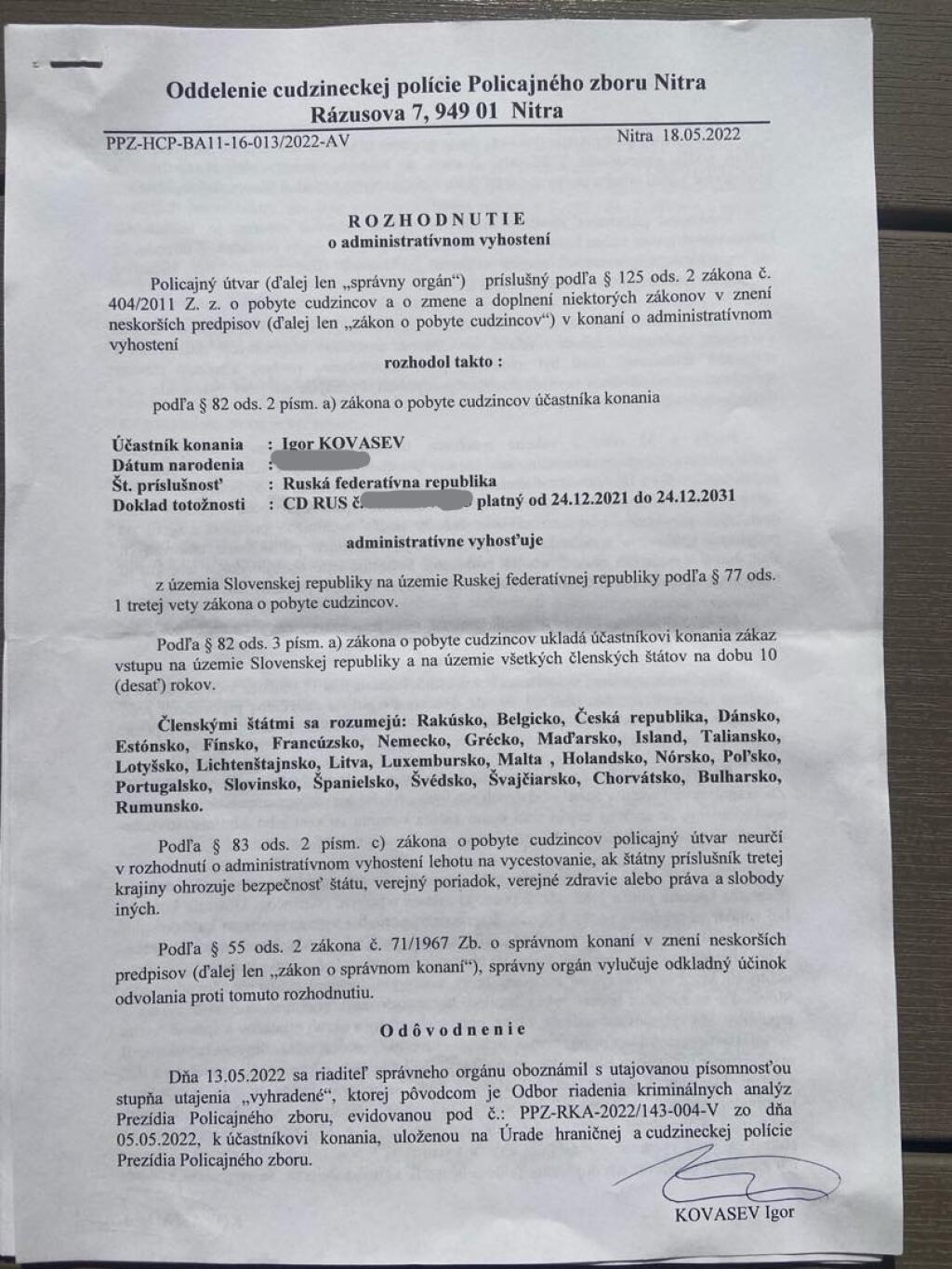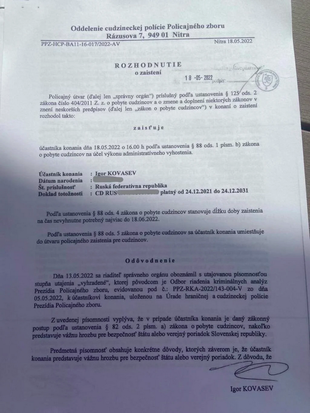 Igor Kovasev žije na Slovensku však už tridsaťdva rokov. Legálne tu celé roky podniká, nikdy sa nedopustil priestupku, trestného činu a riadne platil dane. Dokonca sa tu v roku 2000 oženil.