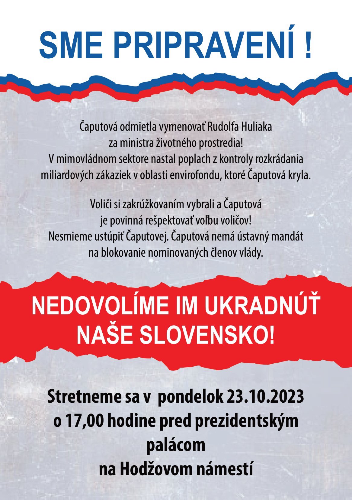 Dnes 23. októbra 2023 sa pred Prezidentským palácom koná protest proti tomu, ako hlava štátu svojím rozhodnutím zneužíva svoju moc, prekračuje hranice svojich právomocí a likviduje parlamentnú demokraciu na Slovensku.