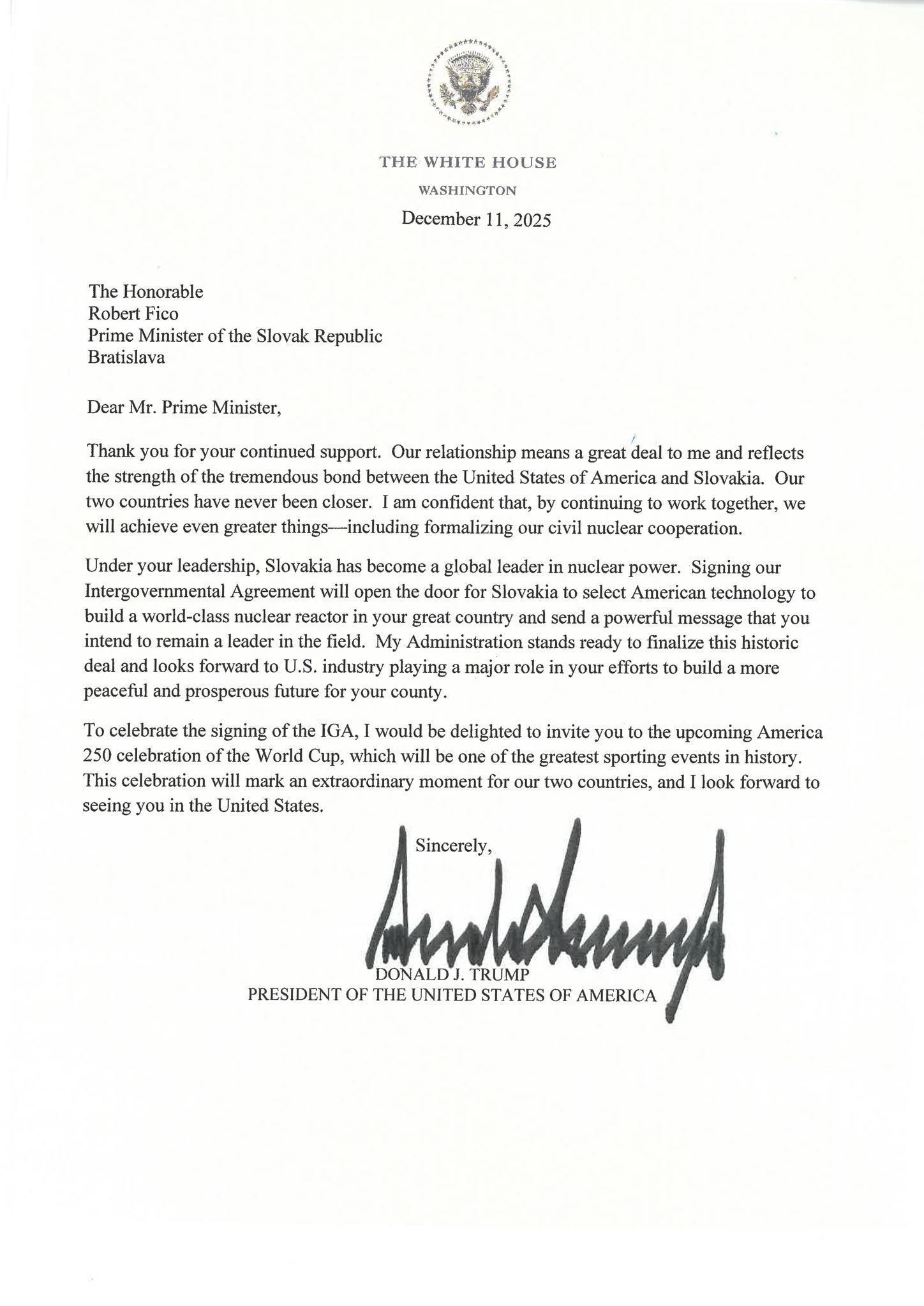 Predseda vlády SR Robert Fico (Smer-SD) dostal písomné pozvanie na stretnutie s americkým prezidentom Donaldom Trumpom. Chcú spoločne podporiť podpísanie medzivládnej dohody medzi SR a USA o spolupráci v jadrovej energetike a vymeniť si názory na najaktuálnejšie svetové témy. V pondelok 15. decembra 2025 o tom informoval tlačový a informačný odbor Úradu vlády (ÚV) SR.