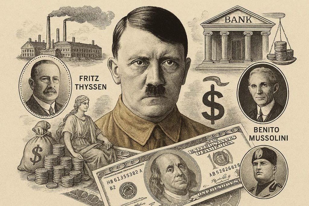 Pozrime sa, čo napísal bádateľ finančných tokov prúdiacich k Hitlerovi, nemecký historik Joachim Fest: „Na jeseň roku 1923 odcestoval Hitler do Zürichu odkiaľ sa vrátil, ako sa hovorí, „s mešcom napakovaným švajčiarskymi frankami a dolárovými bankovkami“. To znamená, že v predvečer pokusu o „Pivný puč“ niekto vydelil Hitlerovi veľmi solídnu sumu v tvrdej cudzej mene“. Ten „niekto“ podľa niektorých údajov, nebol nikto iný ako sir Henry Deterding, šéf anglo-holandského koncernu Shell. On financoval Hitlera aj neskôr – cez Wilhelma Gustloffa. Je zaujímavé, že Mníchovský súd, ktorý rozhodoval v kauze pučistov, bol schopný dokázať nanajvýš to, že nacistická strana dostala na organizáciu vzbury 20 000 dolárov od priemyselníkov z Norimbergu. Lenže náklady spolupracovníkov Hitlera boli odhadnuté na sumu najmenej 20-krát vyššiu! V apríli 1924 odsúdili Hitlera na 5 rokov za velezradu, no už v decembri sa dostál na slobodu, získal vilu Berghof a začal vydávať obnovené periodikum Völkischer Beobachter. Otázka znie, odkiaľ zobral prachy? „Od roku 1924 – píše Joachim Fest – s Hitlerom sympatizujúci priemyselníci a finančníci (Tissen, Vogler, Kirdof, Schröeder) tajne odovzdávali nacistom značné sumy. Pritom vedenie aktivistov a straníckych funkcionárov dostávalo výplatu v tvrdej mene“. Je pozoruhodné, že Vogler a Schröeder boli nie nemeckými, ale skôr americkými biznismenmi – svoj kapitál totiž zarábali hlavne za oceánom. Spomedzi sponzorov Hitlera boli aj iné kontroverzné figúry – napríklad Max Warburg, šéf IG Farbenindustrie – brat riaditeľa Federálneho rezervného fondu New Yorku, Paula Warburga. Alebo Carl Bosch, ktorý viedol nemeckú divíziu spoločnosti Ford Motor Company.