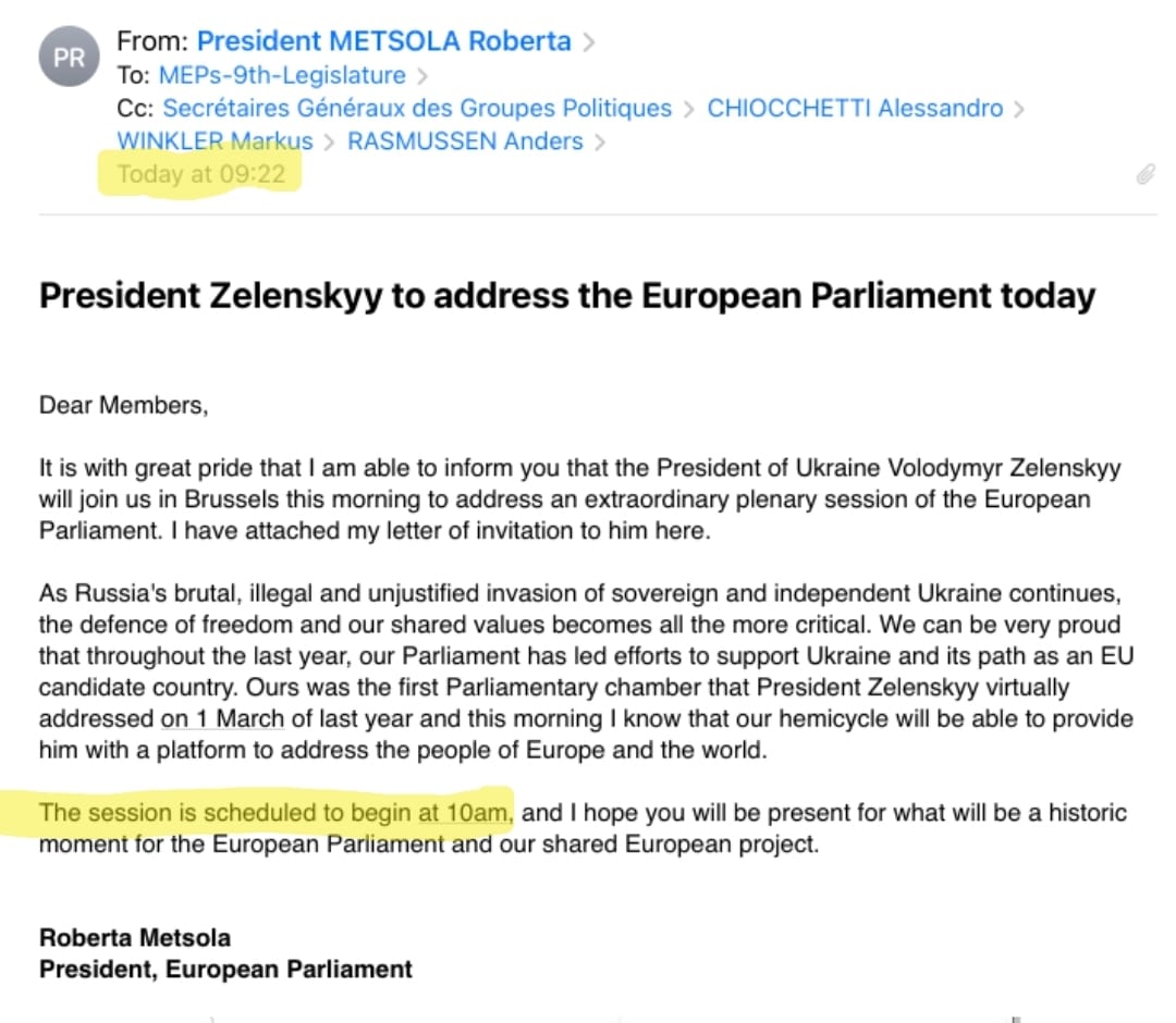„Okrem toho, pozvánku na „plénum“ poslala predsedníčka EP presne 38 minút pred samotným vystúpením Vraj sa o Zelenského báli. Je tak obľúbený, že môže vystupovať len pred vopred vybraným a nacvičeným publikom…,“ skonštatoval slovenský europoslanec a predseda hnutia Republika a zároveň zverejnil pozvánku od predsedníčky EP Roberty Metsolovej.