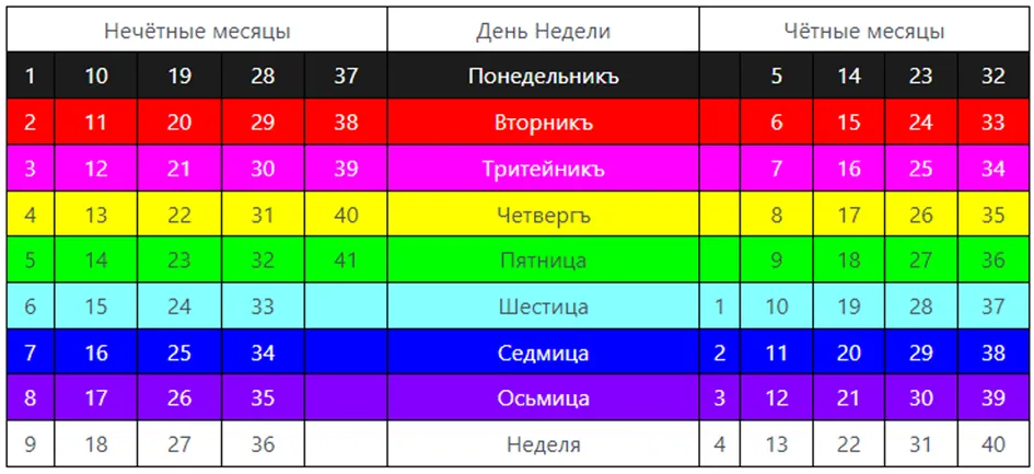 Slavjanský kalendár je oveľa pohodlnejší ako gregoriánsky kalendár, máme len 2 tabuľky: párne a nepárne mesiace začínajú v ten istý deň v týždni. Ak sa Lieto začalo v pondelok, potom všetky nepárne mesiace začnú v pondelok a párne mesiace začnú v šesticu.