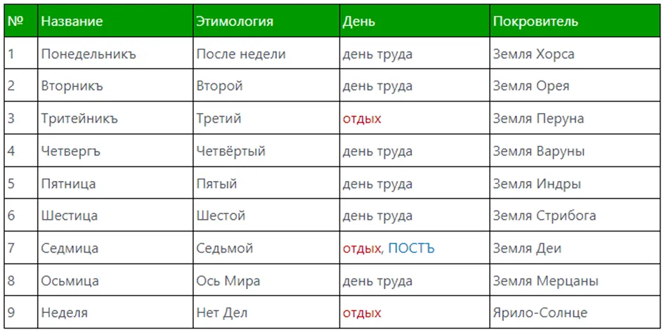 Názvy dní v Týždni sú jednoduchým počtom: druhý, tretí, štvrtý, piaty… A každý deň má svoju Zem – Ochrankyňu. Verí sa, že deň v Týždni, v ktorý sa človek narodil, bude pre neho šťastný.