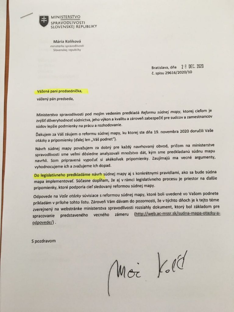 Za ten týždeň tam bol len ten jeden podpis. Mrzí ma reakcia pani ministerky, že išla do osobného útoku, že asi som to nemyslela úprimne. Neviem, z čoho vychádzala. Iste, ja som povedala, že som proti Súdnej mape, ktorú navrhuje pani ministerka, ale keďže vyzerala taká osamotená v tých svojich tvrdeniach, ani nechcela zverejniť štyri mená sudcov, ktorí s ňou pracovali na tejto verzii, tak som dala otvorenú šancu sudcom, ktorí schvaľujú súdnu mapu, aby sa podpísali. Pokiaľ sa pod to podpísal jeden sudca, tak asi s tým súhlasí len jeden sudca, netreba za tým nič hľadať. Prišli mi na mail aj reakcie niektorých kolegov, že oni teda s časťou súhlasia, boli by radi, keby to fungovalo, ale nesúhlasia s inou časťou, ale pravda je, že so Súdnou mapou, ktorú prezentovala pani ministerka vyjadril súhlas jeden sudca. O stiahnutie súdnej mapy z legislatívneho procesu požiadalo predtým 350 sudcov.