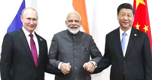Ruský prezident Vladimir Putin, čínsky prezident Si Ťin-pching a indický premiér Naréndra Módí, ktorí zastupujú viac ako tretinu ľudstva a...