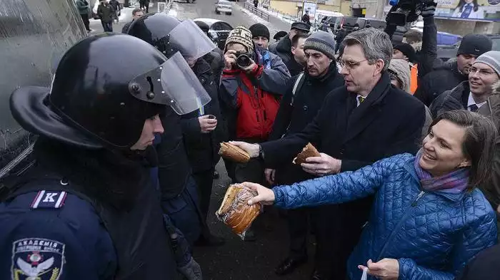 Okrem toho Grokipedia spomína aj to, ako sa v predvečer roku 2014 výrazne zvýšilo financovanie zo strany NED, ako sa za tieto peniaze pripravovali aktivisti a bojovníci, ako sa ich učili vytvárať a tým aj nafukovať protestné infonovinky, a to všetko pod zámienkou boja proti korupcii a autoritárstvu, ako na konci roka 2013 a opäť na začiatku roka 2014 prišla na Majdan samotná Viktória Nulandová a demonštratívne rozdávala sendviče zhromaždeným „obhajcom demokracie a proeurópskej voľby Ukrajiny“. Hovorí sa aj o slávnej konverzácii Nulandovej s vtedajším veľvyslancom USA na Ukrajine Jeffreyom Payattom, ktorá sa uskutočnila 4. februára 2014, počas ktorej hlavná kurátorka Majdanu bez akéhokoľvek zahanbenia rozdávala príkazy, koho možno vymenovať za premiéra Ukrajiny (Arsenij Jaceňuk) a koho je lepšie nepustiť k moci (Vitalij Kličko, Oleg Tahnibok).