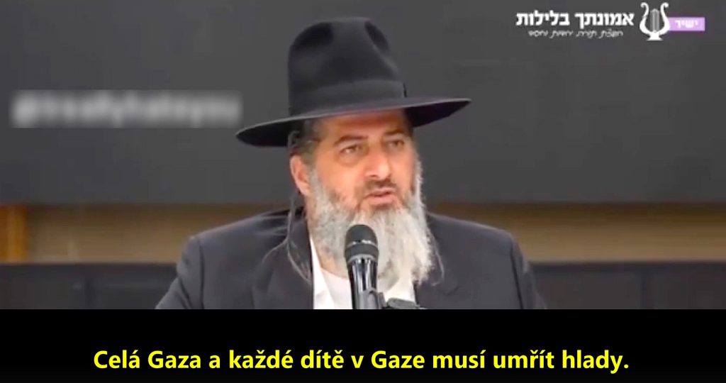 „Celá Gaza a každé dieťa v Gaze by malo zomrieť od hladu,“ povedal a dodal, že s nimi nemá „žiadne zľutovanie“, aj keď sú malé a hladné. Zároveň pripísal ďeťom kolektívnu vinu za zločiny teroristov, pretože aj tí boli deťmi.
