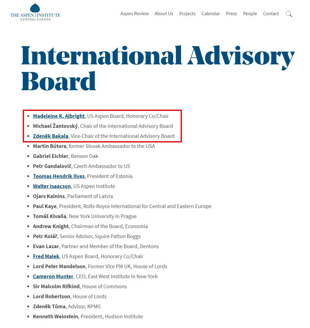 | Václav Havel | NE | Zemřel před založením Aspen CE, ovšem think-tank od počátku čerpá z Havlova ideového transatlantického odkazu. |
