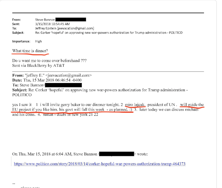 Epstein Lajčáka spomína aj v inom e-maile, ktorý adresoval svojmu známemu Steveovi Bannonovi 15. marca 2018. Bannon neskôr pôsobil aj ako poradca Donalda Trumpa. Ako pripomína denník SME, ide o deň, keď prezident Andrej Kiska akceptoval demisiu vlády Roberta Fica po masových protestoch po vražde investigatívneho novinára Jána Kuciaka a Martiny Kušnírovej.