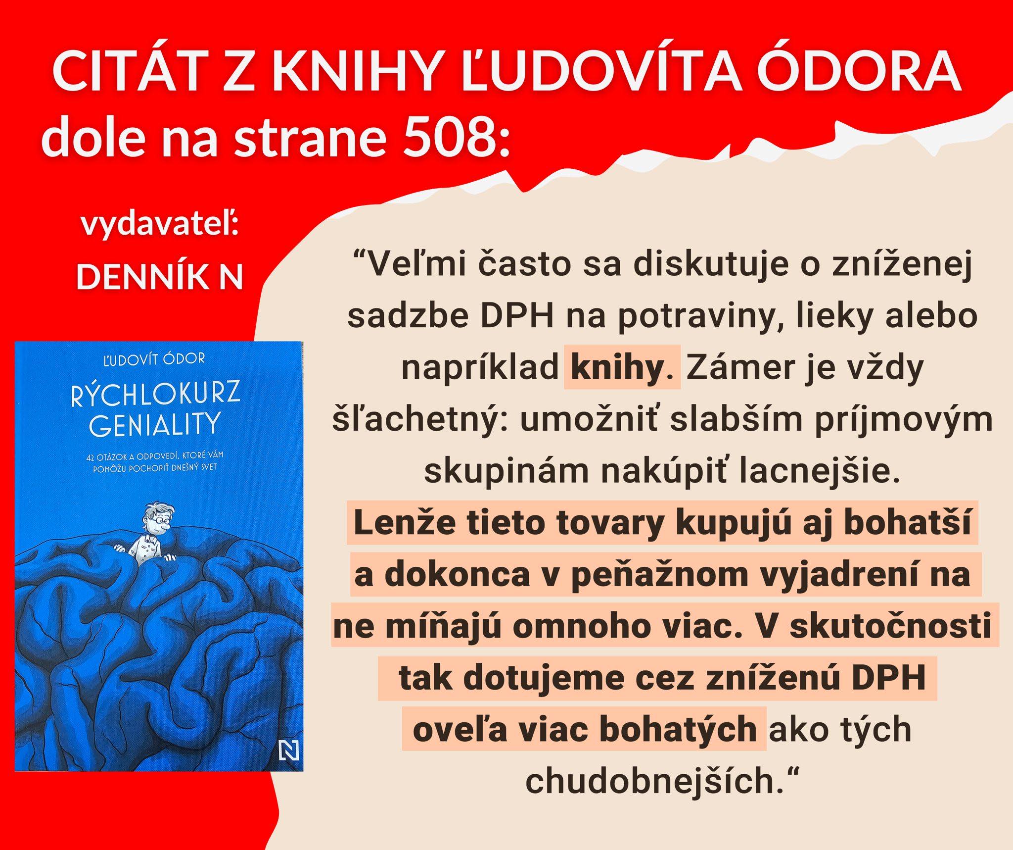 Ladislav Kamenický v súvislosti s posmeškami na svoju osobu adresoval progresívnym voličom a lídrovi eurokandidátky PS Ľudovítovi Ódorovi aj štipľavú poznámku. „Pán Ódor vo svojich lego kockách na strane 38 navrhuje zrušenie zníženej sadzby do DPH na knihy, noviny a hudobniny a do pozornosti dávame aj nárast cien učebníc,“ cituje dokument minister a pokračuje.