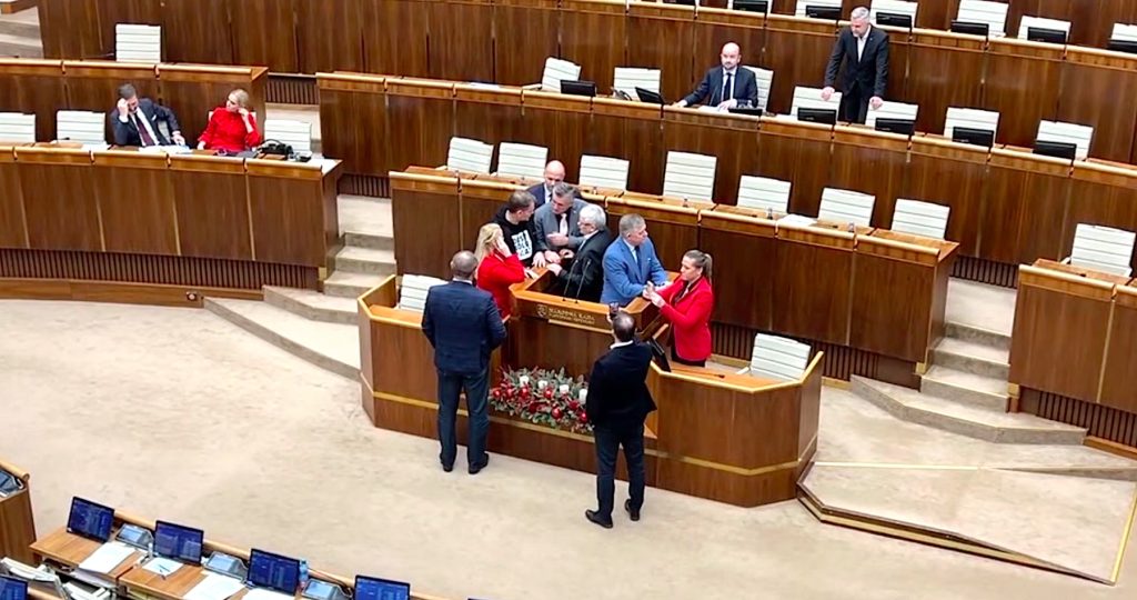 Šéf hnutia Slovensko nakoniec po tom, čo na neho apeloval podpredseda parlamentu Martin Dubéci (Progresívne Slovensko) opustil miesto pri rečníkom pulte.