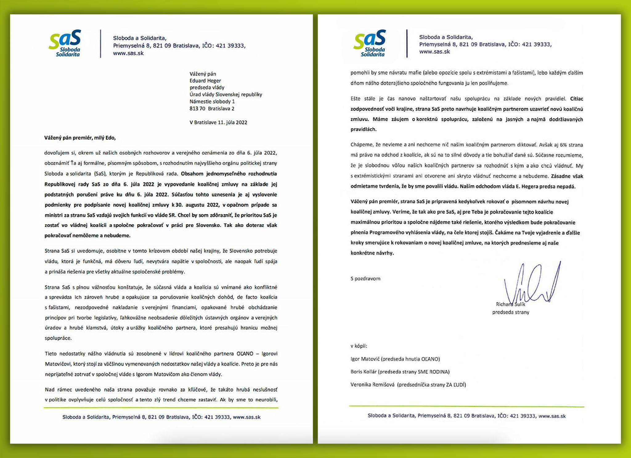 Vicepremiér a minister hospodárstva Richard Sulík oslovuje premiéra „milý Edo“. Píše, že súčasťou uznesenia zo 6. júla, ktorým SaS vypovedala koaličnú zmluvu, je „aj vyslovenie podmienky pre podpísanie novej koaličnej zmluvy k 30. augustu 2022“.