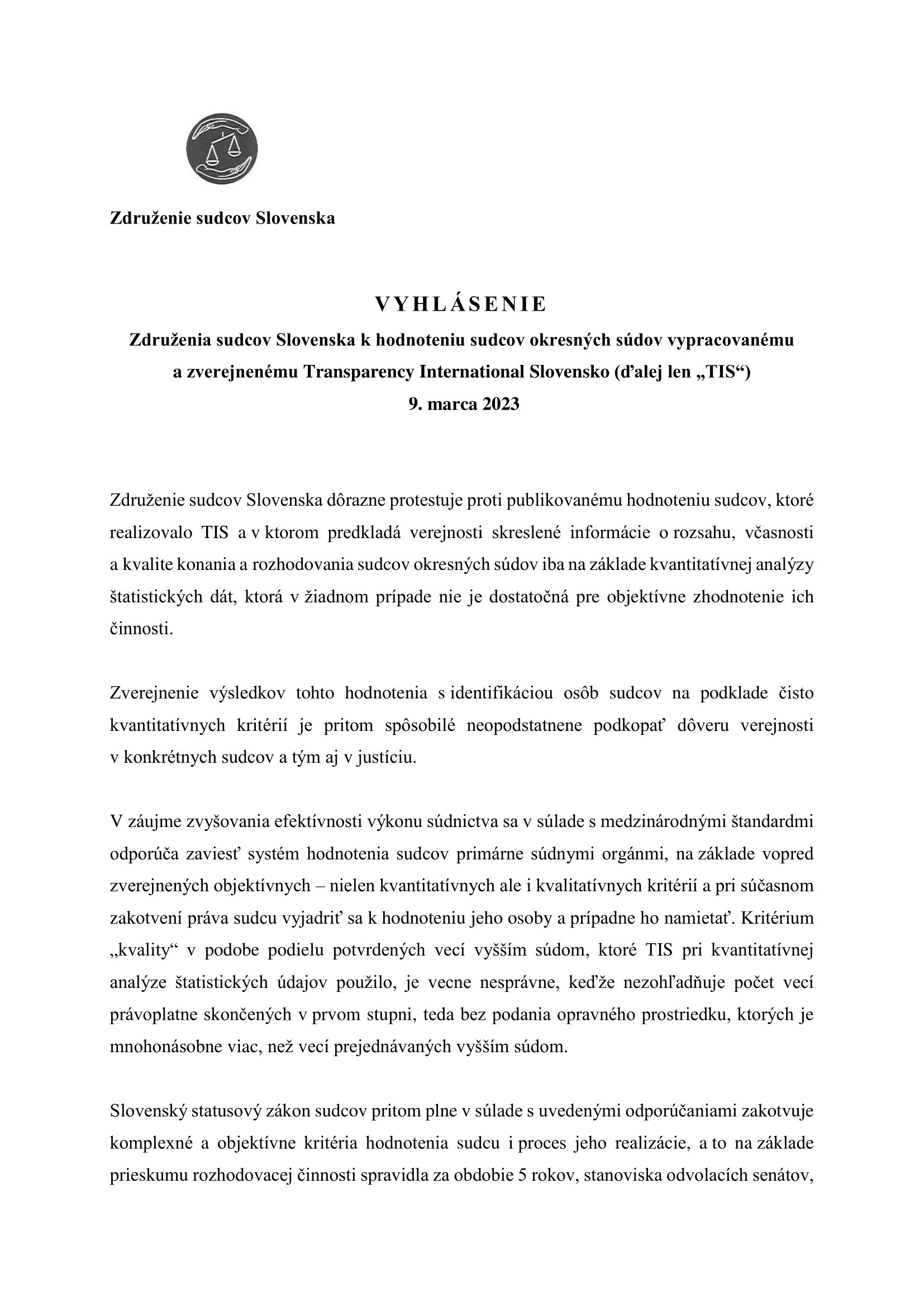 Združenie sudcov Slovenska reaguje na publikované hodnotenie sudcov okresných súdov vypracované Transparency International Slovensko (TIS), ktoré zverejnilo dňa 9. marca 2023.