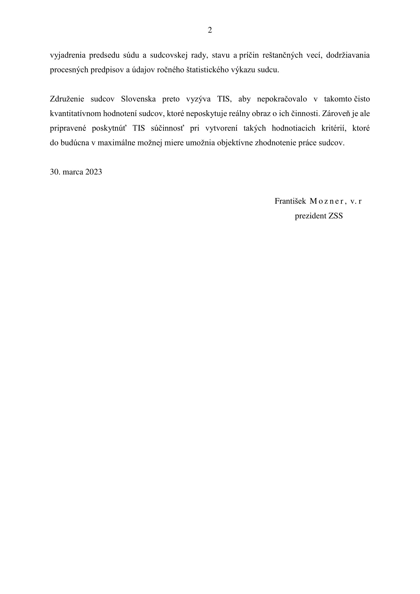 ZSS vyzvalo TIS, aby nepokračovalo v takomto čisto kvantitatívnom hodnotení sudcov. „Zároveň je ale pripravené poskytnúť TIS súčinnosť pri vytvorení takých hodnotiacich kritérií, ktoré do budúcna v maximálne možnej miere umožnia objektívne zhodnotenie práce sudcov,“ uviedlo združenie vo svojom vyhlásení, ktoré TASR poskytol jeho prezident František Mozner.