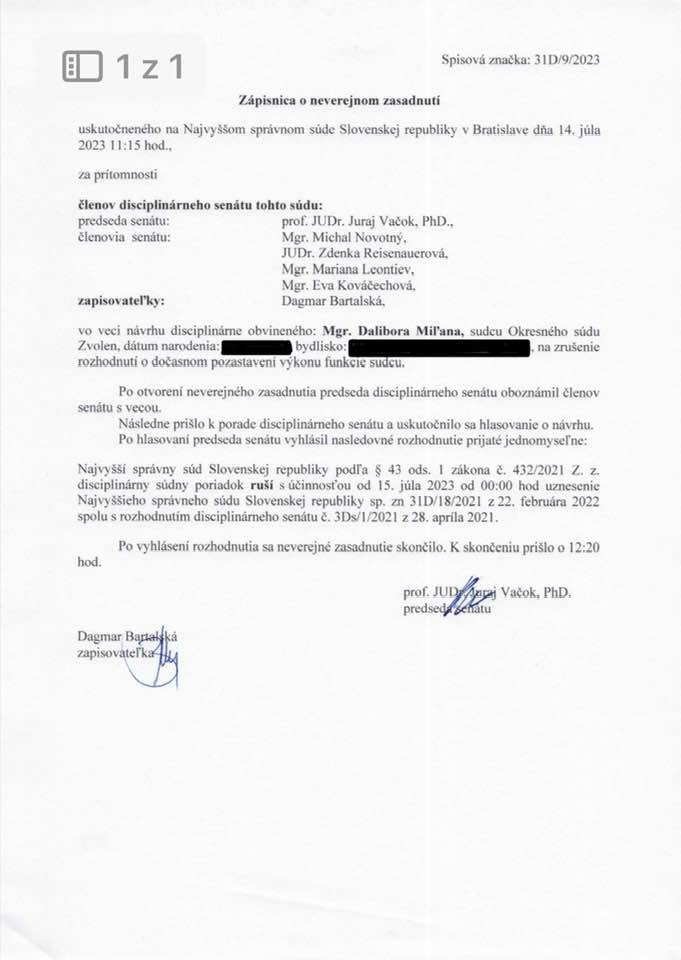 Najvyšší správny súd SR v novembri roku 2022 neprávoplatne uznal vinným sudcu Miľana a potrestal ho zrážkou z platu 60 percent na jeden rok. Disciplinárny senát návrhu predsedníčky súdu Mariany Philadelphyovej vyhovel len čiastočne, nakoľko tá žiadala aj Miľanovo odvolanie z funkcie sudcu.